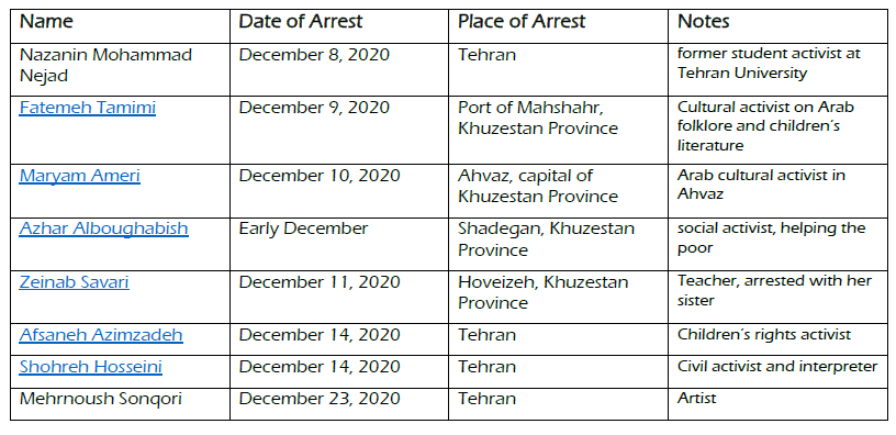 Security forces continued to arbitrarily arrest female activists during December. Some of them are listed below: