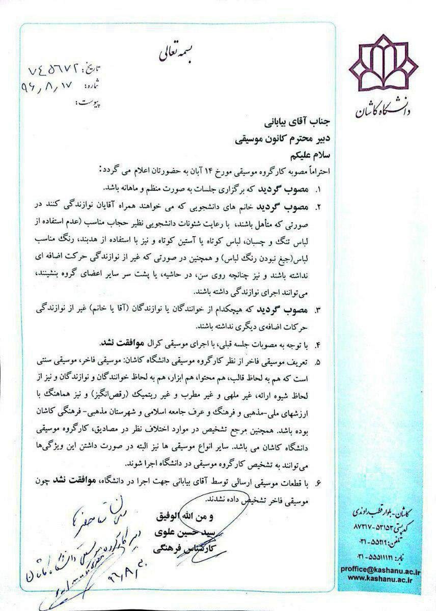 أصدرت جامعة «كاشان» قرارا بتاريخ 9نوفمبر2017 شرحت فيه شروط ساخرة لعزف الطالبات في الحفلات الموسيقىة للجامعة شهريا. وبعض من تلك الشروط المدرجة في القرار هي : تزوج العازفات وعدم استخدام الملابس الضيقة والقصيرة اوذو كمام قصيرة وعدم تنفيذ حركات إضافية والجلوس في الهامش وخلف الرجال.
