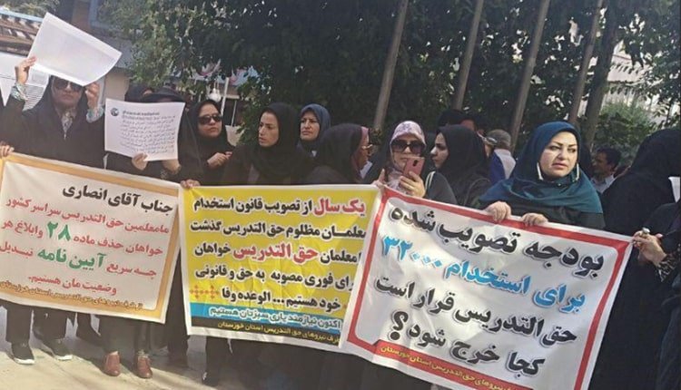 كما نظم التدريسيون في طهران يومي الأحد والاثنين 4 و5 أغسطس تجمعًا احتجاجيًا أمام دائرة التعليم والتربية بطهران. المحتجون ومعظمهم من النساء، كانوا يحملون لافتات احتجاجية، كتب على إحداها: التدريسي المظلوم لا يقبل التمييز. كما هتفوا بشعارات بسبب عدم تنفيذ قانون توظيف التدريسيين رسميًا : «لا نريد وعودًا، بل نريد تنفيذ القانون». و«لن أغادر هنا حتى أحصل على حقي».