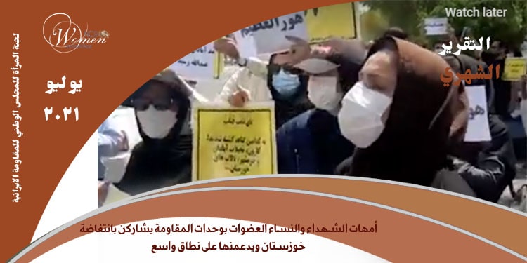فعلى سبيل المثال، نظمت النساء المتقاعدات في مدينتي طهران وكرج، والممرضات في أكبر مستشفى في كرج، والمعلمات بالحصة، وكذلك النساء في مجلس إدارة الأسرة وربات البيوت الثكلى بسبب فقدان أحبائهن في جائحة كورونا؛ وقفة احتجاجية أمام مجلس شورى الملالي في طهران، وربطن صوت احتجاجهن بانتفاضة خوزستان، وطالبن بالإطاحة بنظام الملالي الفاشي، ووصفن مسؤولي هذا النظام باللامبالاة، ووقفن في وجوههم بشجاعة أكثر من مرة وأعربن عن احتجاجهن بأعلى صوتهن.