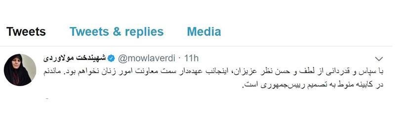 هذا وأكدت ”مولا وردي“ مساعدة في حكومة روحاني في شؤون النساء في حسابها التويتر قائلة: «إني لست حالياً في أي منصب لشؤون النساء وبقائي في الكابينة مشترط بقرار الرئيس روحاني ».(وكالة إيلنا 31/ يوليو –تموز 2017)الحكومية .
