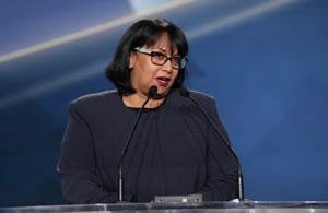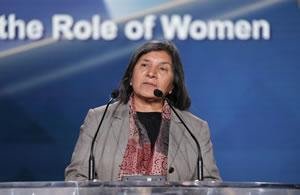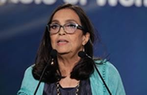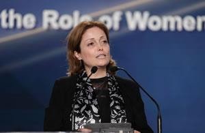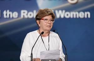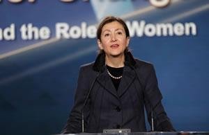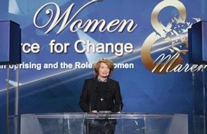 أنا سعيدة جدا لأننا هنا جنبا إلى جنب السيدة رجوي. نحن نفقد الطريق، عندما لا يكون هناك أحد للدلالة. اني آملة أن تكون القيادة النسائية اليوم مختلفة عن قيادة الرجال. كان هناك دائما نقد بأن المرأة غير قادرة على قيادة العالم وتكون خلاقة حقا. وهن لسن ممثلات للسلام. ولكن الآن يمكننا أن نرى أن المرأة يمكن أن تفعل كل هذا. وهناك حاجة مشتركة للعمل معا من أجل السلام والحرية والثقة في الإمكانات البشرية.