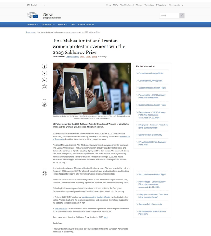 قامت السيدة روبرتو ميتسولا، رئيسة البرلمان الأوروبي، يوم الخميس 19 أكتوبر، بإعلان الفائزين بجائزة ساخاروف لعام 2023، مهسا أميني وحركة المرأة، الحياة، الحرية، مع “الاحترام لجميع أولئك الذين ضحوا بحياتهم من أجلها”. وقالت: “البرلمان الأوروبي فخور بكونه يقف بجانب أشخاص شجعان يواصلون النضال من أجل المساواة والكرامة والحرية في إيران”.