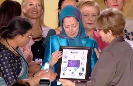 ثم دعت إحدى المدافعات عن حقوق النساء، مريم رجوي إلى اعتلاء المنصة ليقدمن لها درع البيان المشترك للنساء. وقدمت السيدة رجوي شكرها للوفد وقالت: مشاركة النساء من ربوع العالم دعما للمرأة الإيرانية والمقاومة الإيرانية أمر قيّم جدا.