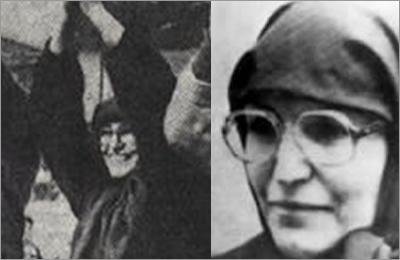 مادر مجاهد معصومه شادمانی (مادر کبیری). در سمت چپ هنگام آزادی از زندان شاه همراه با آخرین دسته از زندانیان سیاسی آزاد شده