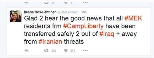 و طی پیامی در توئیتر خود نوشت: «از شنیدن خبرهای خوب که تمامی سازمان مجاهدین خلق, ساکنان کمپ لیبرتی به سلامتی به خارج عراق , دور از تهدیدات رژیم ایران منتقل شدهاند خوشحال هستم» .