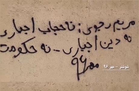 Dans une autre photo à Shoushtar (sud-ouest de l’Iran), on peut voir le slogan « Maryam Radjavi: non au voile obligatoire, non à la religion obligatoire, non au gouvernement obligatoire ».
